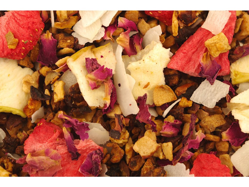 Sušené jablko (kostky a chipsy), plátky kokosu, lyofilizovaná jahoda, přírodní aroma, růžové okvětní lístky.