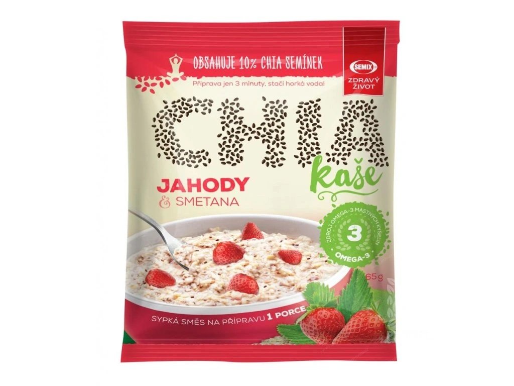 Ovesné vločky 63 % , cukr, semeno chia (Salvia hispanica) 10 %, sušené mléko polotučné, lněné semínko, jahody sušené mrazem 1,5 %, mořská sůl, sušená smetana 0,2 %, přírodní aroma. Může obsahovat stopy sóji, vajec, suchých skořápkových plodů a sezamu.