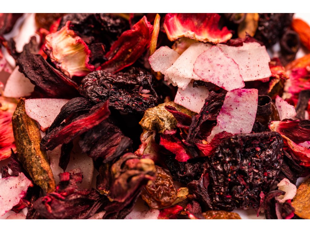 Složení: Květy ibišku, sušené třešně, kokosové chipsy, sušené hrozny, Goji bobule, aroma.